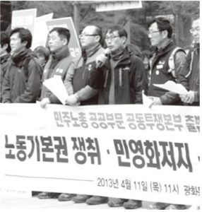 이에 맞서 지난 4월 11일 전교조·공무원노조·공공운수노조/연맹·보건의료노조 등이 ‘민주노총 공공부문 노동기본권 쟁취와 민영화 저지·사회 공공성 강화를 위한 공동투쟁본부’(공공부문 공투본)를 결성했다.