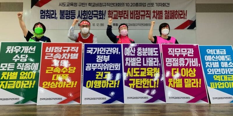 서지애(초등학교 교사, 전교조 조합원) 학교비정규직 노동자들이 83.7퍼센트 찬성으로 10월 20일 민주노총 파업에 나선다. 전국학교비정규직노동조합은 역대 최대의 파업을 벌이겠다고 밝혔다. 학교비정규직 노동자들은 임금 차별을 키우고, 필요한 지원을 하지 않는 정부와 교육감들에 항의하고 있다. 이들은 급식실 인원 충원, 돌봄전담사 8시간 전일제화, 교육 복지 강화를 요구한다. 10월 12일…